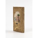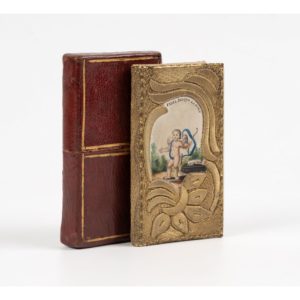 large encadrement floral brodé de fils dorés et deux compositions peintes au centre des plats d'un petit Amour avec son chien, légendées "Fidel jusqu'à la mort" et "La fidélité me condhui", gardes de moire violette, étui de maroquin bordeaux doublé de papier peint (Rel. ép.). SUPERBE EXEMPLAIRE DE RELIURE BRODÉE, EN PARFAIT ÉTAT.