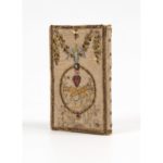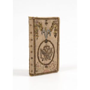 RELIURE BRODÉE. - Mœurs (Les) des premiers âges ou L'École des antiquités. Almanach moral et lyrique. Paris, Janet, (1792). In-24, 58 x 93 mm, 24 pp., soie ivoire brodée et perlée : oiseau bicéphale dans un médaillon sur le plat sup., un...