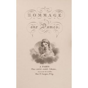 (1819). Titre gravé en noir, et 12 figures à l'antique gravées en couleurs. Calendrier dépliant in fine. Étui (lég. passé) et volume (bel état) en cartonnage de soie, avec lithographies en couleurs. Intéressante provenance : ex-libris Félix Meunié, auteur d'une "Bibliographie de quelques almanachs illustrés des XVIIIe et XIXe siècles, 1765 à 1800". Ex-dono manuscrit sur une garde : "Souvenir de Madame Montoud 7 avril 1855". Rousseurs sur les ff. de texte. - Almanach dédié aux dames. Paris, Le Fuel, Delaunay, (1812). Titre gravé en noir, et 6 figures gravées en noir. "Souvenirs" in fine. Étui (lég. passé) et volume (bel état) en cartonnage de soie, avec lithographies en couleurs. Rousseurs. - Almanach dédié aux dames. Paris, Le Fuel, Delaunay, 1819. Titre et 6 figures gravés en noir. Musique notée et "Souvenirs" in fine. Étui et volume en cartonnage de soie, avec lithographies en couleurs. Bel état. Rousseurs - Hommage aux dames. Paris, Janet, 1820. Titre gravé et 6 figures en noir. Étui et volume en cartonnage papier, avec lithographies en couleurs (frottées). Petite tache dans le volume. - Le Parterre de Flore. Paris, Janet, 1820. Titre gravé et 12 planches de fleurs en couleurs. Étui et cartonnage de soie ivoire, ornés d'un encadrement doré.