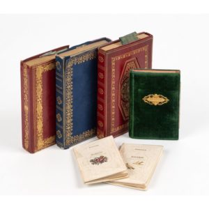 l'ép.). Titre orné et 14 gravures de fleurs, le tout colorié. Rousseurs. Joints 5 volumes : - Rossini français. Paris, Janet, (1824). In-24, soie bleue, roulette dorée, dos lisse orné, tranches dorées, étui de même (Rel. de l'ép.). Titre et 6 planches gravés. Rousseurs. Étui abîmé (petit trou, effiloché, taché). - Almanach de Gotha pour 1835. In-8, maroquin rouge souple, roulette dorée, dos lisse orné, tranches dorées (Rel. ép.). 8 portraits. Rousseurs, petits frottements. - CARNET vierge, 65 x 90 mm, velours vert, pièce métallique dorée gravée "Souvenir", doublure de soie rose avec soufflet et 3 passants avec leur stylet. - Petite galerie d'histoire naturelle. Les Oiseaux. - Les Fleurs. Imprimerie de Maulde et Renou, s.d. (vers 1830). - 2 vol. cartonnage illustré de l'éditeur, 52 x 80 mm, chacun illustré de 2 planches en couleurs. Bon état.