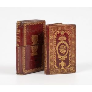 SOIRÉES (Les) de Célie ou Recueil de chansons en vaudevilles et ariettes. Paris, Janet, (1792). In-24, maroquin bordeaux, encadrement doré et trophées au centre, dos lisse orné, gardes de papier dominoté doré, tranches dorées, étui de...