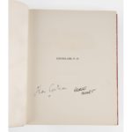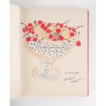 groseille, large pièce de box brun clair sur les plats, titre poussé à froid au premier plat, dos lisse, tête dorée, couv. et dos conservé, étui imitation balsa bordé du même maroquin (Alix). Edition originale, illustrée de 16 lithographies originales en couleurs. Tirage à 100 exemplaires. Un des 80 sur vélin de Rives, après 20 sur vélin Montval, signé par Cocteau et Hugnet. Sur le faux titre, bel envoi avec un dessin aquarellé de Georges Hugnet "à l'ami René Dulsou, convive des meilleurs repas, en souvenir des nappes de l'amitié, 14 avril 1952, Georges Hugnet" René Dulsou entretint une relation orageuse avec Max Jacob de 1932 à 1935. Exemplaire enrichi d'un fragment de nappe replié dédiée à une amie, Eydée (Fortin ?), daté 12.4.47, monté sur onglet ; il contient un triple envoi poétique, signé de A. Beaudin (4 vers), Louis Barrot, Georges Hugnet (5 vers) et René Dulsou ; avec un dessin original à l'aquarelle signé Denyse Parrot, représentant un oiseau sortant de sa cage.