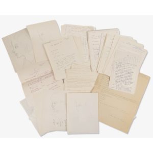 stylo bille bleu, rouge ou au crayon à papier. Esquisses, notes, brouillons, ébauches... avec 7 dessins originaux, dont un portrait de profil de Francine Weisweiller ; 4 portraits de Jean Marais, 1 esquisse, et 3 portraits, dont 1 très cubiste sur un feuillet in-folio plié, 1 représentant " Doudou ", Edouard Dermit, que Cocteau adoptera et qui sera son légataire universel. Les dialogues s'ébauchent et s'affinent : "- C'est un crétin. - Non, un idiot. - C'est pareil. - Non, le crétin est un idiot pensant "... Dans ces premiers brouillons, le héros s'appelle encore Ulrich. Des personnages qui ne seront pas retenus surgissent, comme un curé, et l'on voit que Cocteau a même songé à introduire dans sa pièce le Diable en personne. Très important ensemble préparatoire, provenant de la collection Francine Weisweiller, une des plus proches et fidèles amies de Jean Cocteau, qui séjourna souvent dans sa célèbre Villa Santo-Sospir.