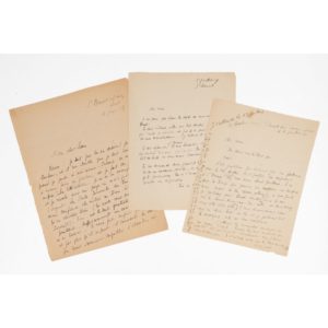 condition qu'on cherche Dieu (...). Il nous fait souffrir quand il le faut et pas plus qu'il ne faut : il connaît la dose que nous sommes capables d'absorber et force la violence pour les gens et les nations qui ont perdu la sensibilité ou ne l'ont jamais eue. (...) Je te souhaite de demander au ciel d'augmenter ta foi. (...) tous les grands esprits ont cru en Dieu même Voltaire." - 1er 1939 : 1 page in-folio, au sujet de la préparation d'un voyage dans sa Bretagne natale, Quimper. Pour ces "joyeux projets", il compte passer à St Brieuc chez son ami Louis Guilloux, puis "je partirais pour Brest bientôt (dans le cas où la sœur-Anne-au-bon-cake et toi vous seriez dans cette chère ville), je vous demanderais alors une ou deux tasses de thé et je partirais vers la verdoyante côte de ma naissance." - puis le 5 juillet, il précise ses obligations de visite pour ce même voyage : son "confrère très ami [qui] ne me laissera pas partir tout de suite et nous avons beaucoup à dire. Je me demande donc quand je serai libre. Mais je te préviendrai à l'avance de façon que tu puisses me répondre."