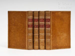 ff, 406 pp, 3 planches h. -t. // 4 ff, 414 pp, 9 planches h. -t. // 4 ff, 407 pp, 10 planches h. -t. ), plein maroquin citron, dos à nerfs finement ornés à la rocaille, triple filet sur les plats, dentelles intérieures (Reliure de l’époque probablement française). Bel exemplaire. Premier tirage des vingt-cinq gravures de Folkema, Fokke, Tanje d'après les dessins de Coypel ; le portrait (non signalé par Rius, 39) est remonté. Cohen, 215-216. Palau, 52012 : "Edicion buena" arreglada según la edición de Londres (1738). "Linda Edicion" Signature-ex-libris du XVIIIème siècle sur le feuillet blanc "Haguenin».