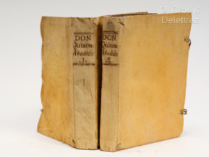 de l'époque, lacets et cabochons de fermeture en nacre conservés. Bel exemplaire malgré quelques cernes pâles in fine du tome II. Nueva edicion corregida, e illustrada con quarenta y quatro laminas muy apropiadas à la materia, y añadida ahora nuevamenta la Vida de su autor... escrita por Don Gregorio Mayans y Siscar, Bibliothecario del Rey N. S. 2 frontispices + 22 bois (tome I) ; 20 bois (tome II). Gravures très naïves et très populaires. Palau, 52013 : Primera edicion hecha en España con la Vida de Cervantes de Mayans y Siscar. A pesar de ser esta tirada igual a la de Madrid, 1741 (antes de 1735), se compuso nuevamente. Rius, 40 ; Henrich, 40.