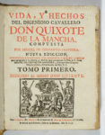 DON QUIXOTE ANADIDO CERVANTES SAAVEDRA (Miguel de). VIDA Y HECHOS DEL INGENIOSO CAVALLERO DON QUIXOTE DE LA MANCHA. Madrid, Juan de S. Martin, 1750. Deux tomes en deux volumes in-4 (12 ff, 72-377 pp, 1 f // 8 ff, 403 pp, 2 ff), plein parchemin souple...