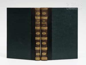 CON EL BUSCAPIE CERVANTES SAAVEDRA (Miguel de). EL INGENIOSO DON QUIJOTE DE LA MANCHA. Madrid, Gaspar y Roig, 1850. Deux tomes en deux volumes in-8, demi-veau vert bouteille, dos lisses très ornés (Pastiche espagnol d'une reliure XIXème). Quelques...
