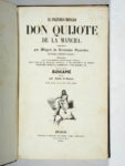 piqûres. Port. xx f. 772 pp. xxxiv (apendice) 2 ff de table. Pour le B USCAPIE xi ff. 84 pp. Novisima edicion clasica, illustrada con notas historicas, gramaticales y criticas segun las de la Academia Espagnola, y sus individuos de numero Pellicer, Arrieta, Clemencin, y por Sales A. M. Aumentada con el BUSCAPIE anotado por Adolfo de Castro. Troisième édition augmentée du Buscapie (brochure publicitaire, probablement mythique destinée à promouvoir le Quichotte) qui prouve le succès commercial de la première (1847). Elle est illustrée d'un portrait par P. Roca et des gravures de Urrabieta, Johannot, Vallejo, Gaspar, Marti, Cibera y Severini. (Palau, 52087). Rius, 118 : Obra corregida y aumentada en esta tercera edición.