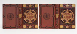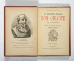 lie-de-vin décorée d'une grande plaque dorée avec le titre au centre dans une grande rosace, et les portraits aux angles de Sancho, D. Quichote, Rosinante et l'âne. Quelques piqûres. Segunda Edicion, illustrada con gran nùmero de grabados en el gusto de Tony Johannot. Envoi manuscrit inconnu d’un souvenir de voyage daté de 1883. Palau, 52182 : édicion igual a la de 1881. Henrich, 186 : Esta edicion formaba parte de la "Biblioteca Amena é Instructiva", y se reimprimio con fecha de 1883. Rius, 187 : Reimpression de la edicion de los Sres. Salvat ella descrita en el nùm. 183. Bel exemplaire.