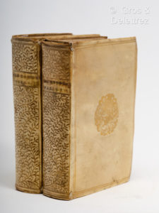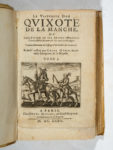 pp (en réalité 835), 2 ff), placés dans deux velins dorés, dos finement ornés de ramages dorés, armes d’une ville allemande (?) sur les plats (Reliure de la fin du XVIIème siècle). Première traduction française complète, la première partie par Oudin et la seconde par Rosset. Première véritable figure de Don Quichotte sur les titres. Palau, 52696 pour la deuxième partie : «El ùnico ejemplar que conocemos existe en la Biblioteca de Cataluña». Rius, 464 signale que «el librero añadio una X manuscrita» pour l’harmoniser avec l’éditiion de 1632. Henrich, 241-242 : El primer tomo està impreso por A. Cottinet y el segundo por A. Coulon. Primera edicion en francés de ambas partes. Ex-libris manuscrit p. 450 du tome I et in fine : Theuvault, procureur du Roy d’ainas. Très bel exemplaire.
