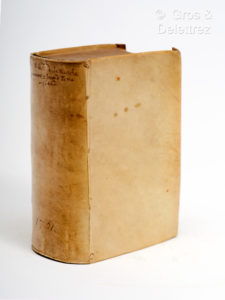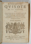 un volume in-8 (8 ff, 730 pp, 3 ff de table // 2 ff, 785 pp, 6 pp de table), plein velin rigide ivoire de l'époque. Saut de page de 782 à 785 sans manque (cf Rius, 467) ; 2 ff de la fin ont été reliés en tête du volume. Perforation p. 147 avec perte de quelques lettres. Rousseurs éparses. Une des premières éditions françaises à donner l'intégralité de Don Quichotte. Reprise des traductions de César Oudin (1614) et François de Rosset (1618). Jusqu'en 1639 ces deux tomes étaient édités séparément. Bardon (Don Quichotte en France) pp. 53-54 qui cite Emile Gebhart : "La France du XVIIème siècle a donc lu ce texte qui rappelle singulièrement par sa souplesse sinueuse, sa grâce naïve et son tour latin, la langue de Descartes. Et c'est justement parce que le français de cette époque était comme une transposition fidèle de la langue latine, que notre traduction se moule avec une étonnante facilité sur le castillan de Cervantes... " Palau, 52701 ne cite pas cette édition à l'adresse de Berthelin, contrairement à Rius, 467. Henrich, 244. Au début et in fine ex-libris «Joh. Baptinty of Axelé» (XVIIIème siècle).