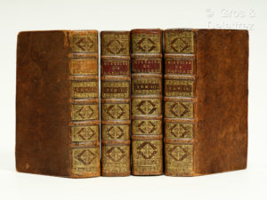 réalité 533) et 2 ff // 4 ff, 567 pp // 628 pp et 3 ff. ), plein veau fauve, dos à nerfs ornés, tranches rouges (Reliures de l’époque). Très bon exemplaire malgré quelques coins émoussés et des coiffes restaurées ; mors fendillés au tome 4. Première édition rarissime de la traduction de Filleau de Saint-Martin (pour les tomes 2, 3, 4 à la date de 1678 ; le premier daté de MDCLXXVIX (sic pour 1679) est en seconde édition. Cette curieuse date pour le premier tome n'est signalée nulle part ! Le tome V (absent ici) de la continuation n’est paru qu’en 1695 et serait dû à Robert Challes. Il se joint à l'édition de 1695 (cf l'exemplaire de la BNF). Palau, 52703 : Este nuevo texto no se sujeta con tanta fidelidad al original, pero resulta màs elegante y ameno. Los tomos primero y secundo se agotaron immediatemente y se reimprimieron con la fecha de 1678 al mismo tiempo que el tercero y cuarto... el éxito constante de esta edicion viene demostrado en las continuadas reimpresiones de su texto. Rius, 470 : si rara esta primera edicion de la traduccion de Sant-Martin ! Henrich, 246. A noter enfin, qu'en raison du succès de ce texte et de sa grande notoriété dès le dix-septième siècle, cette édition est restée anonyme !