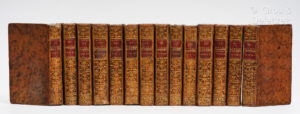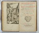 planches // 4 ff, 432 pp, 3 planches // 5 ff, 442 pp, 7 planches // 6 ff, 532 pp, 12 planches // 5 ff, 494 pp, 5 planches // 5 ff, 501 pp, 3 planches), plein veau marbré de l'époque, dos lisses ornés. Quelques coiffes et coins émoussés. Nouvelle édition de la traduction de Filleau de Saint Martin, revue, corrigée et augmentée. Elle est illustrée de quarante planches (certaines sont déplacées) dessinées par Humblot et Bonnard ; gravées par Cars, Mathey et Crepy. Palau, 52737 : ne cite pas cette édition à l'adresse de Nyon dont le privilège doit être partagé avec la Compagnie des Libraires (ni Rius, 494 ; ni Henrich, 267). Il s'agirait d'une réimpression de l'édition de 1732 dont les planches seraient des imitations de Coypel. [Suivi de] : [LESAGE Alain-René]. Suite Nouvelle et Véritable de l'Histoire et des Aventures de l'Incomparable Don Quichotte de la Manche, traduite d'un Manuscrit Espagnol de Cid Hamet Benengely son véritable Historien. A Paris, Chez Nion, 1741. Six tomes en six volumes (2 ff, lxiv, 405 pp, 1 f, frontispice, 10 planches // 4 ff, 418 pp, 9 planches // 4 ff, 424 pp, planche de musique et 4 planches // 2 ff, 449 pp, 3 planches // 2 ff, 518 pp, 5 planches // III, 440 pp, 4 planches) plein veau de l’époque. Cette suite qualifiée d'extravagante par Palau (52732) est attribuée à Alain-René Lesage . [Suivi de] : AVELLANEDA (Alonso Fernandez de). Nouvelles Aventures de l'Admirable Don Quichotte de la Manche : et traduites de l’Espagnol en François pour la première fois. A Paris, par la Compagnie des Libraires, 1738. Deux tomes en deux volumes in-12 (frontispice, viii, 447 pp, 8 planches // frontispice, iv, 509 pp, 8 planches), plein veau de l’époque. 2 planches réparées (pp 93 et 199), un trou p. 197, taches pp 459 et suivantes du tome II. Nouvelle édition de la traduction de cette seconde partie apocryphe attribuée entre autres à Lope de Vega. (cf la fiche consacrée à Avellaneda N°91) Palau, 88052.