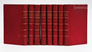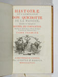 Huit tomes en huit volumes in-12, plein maroquin janséniste rouge, dos à nerfs, tranches dorées sur marbrure (Reliure signée Cuzin). 6 ff. 370 pp// 3ff. 369 pp// 4 ff. 371 pp. // 4 ff. 453 pp // 4 ff. 420pp. // 4ff. 422 pp. //xliv, 358 pp. 2ff. 396 pp. Belle édition traduite par Filleau de Saint-Martin. Elle est illustrée d’un portrait de Cervantes par Kent et de 31 planches de Coypel gravées par Folkema et Fokke. Les Nouvelles Exemplaires comportant 12 figures. Le faux-titre du tome I fait défaut. Palau, 52746 : «Belle édicion una de las mas codiciadas por los bibliofilos. » Rius, 496 : «Una de las mas bellas que en Francia se imprimieron durante el siglo XVIII. » Henrich, 269. Cohen, 217-221. Très bel exemplaire avec l’ex-libris du château de la Rozelle (tampon sec).