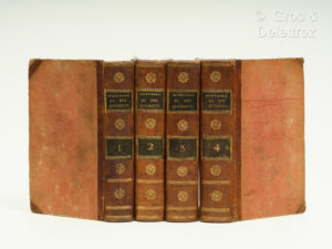 (IV, 500 pp, 2 ff, 7 planches // 2 ff, 526 pp, 1 f. , 3 planches // 1 f, 562 pp, 1 f, 4 planches // 2 ff, 568 pp, 2 ff, 2 planches), demi-basane havane rehaussée de filets et de rosaces dorées, pièces de titre et de tomaison en maroquin olive (Reliure de l’époque). Agréable exemplaire malgré quelques rousseurs. Manque le titre du tome III. Ni Palau ni Rius ne citent d’édition à cette adresse. Bien complet des 16 planches.