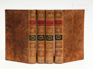 l'époque). Très bel exemplaire malgré une déchirure restaurée p. 439 du tome I. Nouvelle édition revue, corrigée et augmentée de la traduction de Filleau de Saint-Martin. Elle est illustrée de vingt-cinq planches avant la lettre de Coulet, Queverdo y Gaucher d'après les dessins de Coypel. Rare édition signalée par Cohen (220) qui la confond avec celle de Deterville, 1799. Monglond n'a connu que l'exemplaire du bibliophile André Gérard. Brunet III, 1751 ; Graesse II, 107 ; Rius, 512 ; Palau 52762. Bon exemple de l'intérêt constant pour ce texte à la fin du XVIIIème siècle.