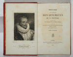 frontispîce, 455 pp // frontispice, 458 pp), demi-veau cerise à petits coins, dos lisses ornés de double filet doré, tranches jaunes (Reliure de l'époque). Bon exemplaire malgré quelques piqûres, coins émousés, légères épidermures. Reprise de la traduction de Filleau de Saint Martin avec un essai sur la vie et sur les ouvrages de Cervantes par M. Auger de l’académie française. L'ouvrage est illustré d'un portrait et de cinq lithographies dessinées par Devéria qui sont ici en premier tirage. Palau, 52780 ; Rius, 529 : planches différentes de l'édition de 1821.