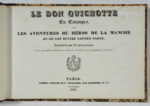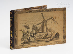 Fruger et C°, Libraires, rue Mazarine, N° 30, 1828. Un volume in-12 oblong, (VI pp, 132 pp. 38 gravures dont le frontispice), plein cartonnage, dos en veau foncé décoré lisse (Reliure de l’époque). petit accroc sur la coiffe inférieure. Une des quatre éditions de format à l'italienne parues en France au XIXème siècle. Elle est imprimée par Casimir. Les planches anonymes sont tirées sur cuivre. Elles sont probablement italiennes car Don Quichotte y est efféminé(!). Palau 52785 ; Rius 532 ; Henrich 313. Très rare avec les deux planches supplémentaires figurant sur le cartonnage (dont les Moulins). Elles ne font pas partie de la suite des 36 gravures décrites dans les bibliographies.