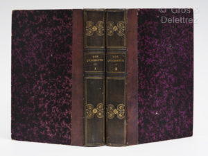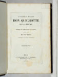 aubergine, dos lisses ornés (Reliure de l'époque) relié sur brochure, non rogné. Quelques piqûres d’usage. Portr. Front. 744pp. // gr. Front. 758 pp. Premier tirage des vignettes de Tony Johannot avec les critères de tout premier tirage signalés par Vicaire (II, 156) : la figure de la page 256 du tome I a le regard tourné vers la droite ; sur le premier frontispice Don Quichotte est représenté assis arborant une moustache. La nouvelle traduction de Louis Viardot est excellente. Carteret, III, 136 : «Un des très beaux livres illustrés du XIXème siècle». Cette édition eut un immense succès.