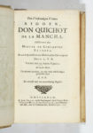 (Reliure hollandaise du XVIIIème siècle). Bel exemplaire. Front. 426pp. 15 ff. Non chif. Cinquième édition hollandaise (la première datant de 1657 étant la première édition illustrée de Don Quichotte). Elle est illustrée d'un frontispice gravé par L. Scherm (identique à celui de 1696) et de 24 planches gravées sur cuivre (les mêmes qu'en 1657). Elles sont anonymes mais Palau les attribue à Savry. Un index alphabétique des noms propres et des paroles les plus notables se trouve à la fin du tome II. La traduction hollandaise (très fidèle) est due à L. V. B. (Lambert Van den Bosch) ; elle est revue par G. V. B. (Broekhuysen). Palau, 53223 ; Rius, 804 ; Henrich, 567.