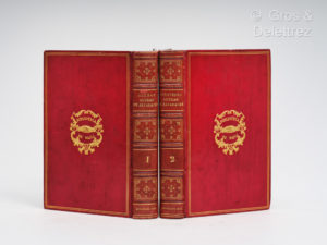 Velpius, 1604. Deux parties en deux volumes in-12, plein veau cerise, dos à nerfs ornés de caissons dorés, fers sur les plats de la "Biblioteca de Salva" (VPS), et filets sur les plats et les coupes, tranches dorées. (Reliures du XIX ème siècle). Bon exemplaire malgré de nombreux feuillets uniformément roussis (comme souvent. ) surtout dans le premier tôme. Dernière édition parue avec la seconde partie de Luxan de Sayavedra. La même année (1604), Mateo Aleman a publié sa propre deuxième partie qui accompagnera désormais les éditions suivantes. La première édition de la première partie date de 1599 et celle de la seconde de 1602. Le succès fut tel qu'on recense 26 éditions (de 2000 exemplaires chacune) de 1599 à 1604. Seule la parution du Quichotte en 1605 éclipsa Guzman d'Alfarache qui, avec le Lazarillo de Tormés, passe pour le prototype du roman picaresque dont Cervantes s'inspirera. Collation conforme à Palau, 6692 qui signale une erreur de pagination dans le premier volume, on saute de la page 167 à la page 178 sans manque de texte. Il comporte donc 198 ff mal paginés 215. Exemplaire provenant de la bibliothèque de Salva quoique ne figurant pas dans son catalogue paru en 1872. Il doit s'agir d'une acquisition postérieure à la publication de sa collection. Super-libris (Salva) sur les plats.
