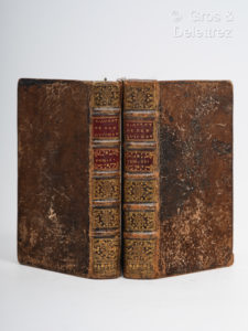 Compagnie des Libraires, 1716. Deux tomes en deux volumes in-12, pleine basane, dos à nerfs ornés, tranches jaspées (Reliure de l'époque maniée), coins et coiffes usés. Plusieurs noms ont circulé pour la paternité de ce "falso Quijote" : Lope de Vega ; Guillen de Castro ; Alarcon ; Argensola ; Barbadillo, etc. Cette édition illustrée de seize gravures signées A. Clouzier "es mas que una traduction, un arreglo hecho con soltura por Lesage". Conforme à la collation de Palau, 88051 qui suppose qu'il s'agit d'exemplaires de la première édition (1704) dont on a changé les pages de titre. Palau, 88033 : «Al fin de la primera parte del Quijote de Cervantes se promete una continuacion o tercera salida, y como habian pasado mas de nueve años sin cumplir la promesa, y el exito editorial era cada vez mejor, no es extraño que otra pluma, previendo buen negocio, se lanzase a usurpar la idea de Cervantes publicando el segundo tomo, o continuacion y fin de la novela mas celebre del mundo".