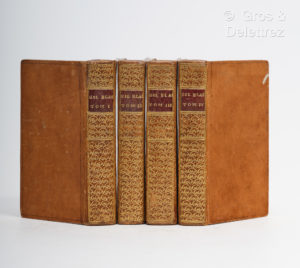 lisses ornés à la grotesque, 2 coins légèrement émoussés, une coiffe usée (Reliure de l'époque). Petite déchirure pp. 21 du tome II sans manque. Bel exemplaire illustré de 32 gravures à pleine page non signées, de superbe facture, et en bon tirage. Cinquième édition dont le tome IV est à la date de la première édition (1735). Sommes-nous en présence d'une contrefaçon parue chez un autre éditeur ? Il est admis aujourd'hui qu'il ne s'agit pas du plagiat d'un ouvrage espagnol. Toutefois les sources sont espagnoles : Marcos de Obregon de Vicente Espinel ; divers romans picaresques ; les mémoires politiques et les pamphlets sur les règnes de Philippe III et Philippe IV. "L'extraordinaire variété des épisodes de ce livre qui d'espagnol n'a que le cadre, mais demeure si typiquement français et en rend la trame très complexe... Gil Blas demeure ainsi un des grands documents du réalisme français, un vaste tableau du monde, imprégné d'une morale indulgente mais jamais cynique. " (Laffont-Bompiani II, p. 554). Palau 136146. Cette édition est inconnue à Cohen, Brunet et Cioranescu.