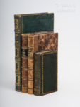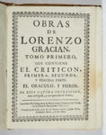 tâches sur les plats. D'après Palau (106848) cette édition reprend celle de 1747 qui est une des plus correctes. Elle est enrichie de tables. Cette édition collective des œuvres du Padre Balthazar contient : - El Criticon ; El Oraculo y Heroe. - La Agudeza ; y Arte de Ingenio ; El Discreto ; El Politico Don Fernando el Catholico y Meditaciones varias... Modeste et discret Gracian a publié ses œuvres sous le nom de son frère Lorenzo. Sa devise "En Nada Vulgar" en fait le disciple de Gongora le chantre de la préciosité et l'un des représentants du "cultisme". Nous sommes là bien loin de la littérature populaire représentée peu de temps avant par Cervantes. Brunet, II, 1687. Ex-libris gravé d'Armando Cotarelo Valledor "Soy de". [On joint] : Baltasar Gracian. L'homme de Cour traduit par Amelot de la Houssaie. La Haye, chez Abraham Troyel, 1685. in-16, plein maroquin vert, tranches dorées (Reliure fin XVIIIème). Dos insolé, coins émoussés. C'est la traduction française du Criticon. Palau, 106911.