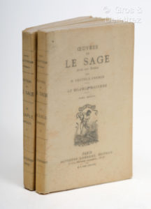 préface d'A. France. Exemplaire sur Chine (n° 29/60) contresigné par l'éditeur. Palau, 136589 : extrait (2 vol. /4) des Œuvres de Lesage ; il signale aussi un frontispice et des gravures que nous n'avons pas. Lesage reprit le roman espagnol El Diablo cojuelo de Guevara publié à Madrid en 1641. "Roman picaresque" trop riche en péripéties mais trop empreint d'un humour purement verbal. Roman de "voyeur" dans lequel Asmodée soulève les toits de Madrid ce qui est prétexte à de nombreux tableaux intimes... Il perpétue ainsi le goût des portraits à la manière de Labruyère.