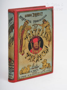 orientaux, d'un chameau, d'un lion et d'un steamer. Quelques piqûres, exemplaire un peu gauchi. 282 pp chif. Première édition illustrée des aventures de ce personnage truculent, véritable succédané de Don Quichotte. A la fin du XIXème siècle, le chevalier à la triste figure est encore dans tous les esprits. Rius, 533 : "El mismo autor declara haber escrito este libro recordando al quijote. El sueño de Tartarin en armaduras, y en aventuras qe no le han pasado, tiene mucho de la fantasia del Hidalgo de la Mancha. "