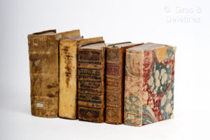 GAULE. LE QUATORZIEME LIVRE. Lyon, Benoist Rigaud, 1577. Un volume in-16 (314 ff + table). Plein papier à la cuve moderne, tranches dorées. Brunet I, 216 : traduction d'Ant. Tyron. [On joint] : AMADIS DE GAULE. LE DOUZIEME LIVRE. Lyon, François Didier, 1577. Un volume in-16 (551 ff + table), plein velin ivoire de l'époque à recouvrement. Traduction de G. Aubert de Poitiers. Brunet I, 216 ; Baudrier, IV, 91. [On joint] : AMADIS DE GAULE. L'ONZIEME LIVRE. Lyon, François Didier, 1577. Un volume in-16 (332 ff + table), plein velin de l'époque. Traduction de Jacques Gohory. Brunet I, 216 ; Baudrier, IV, 90. [On joint] : AMADIS DE GAULE. LE DIX SEPTIEME LIVRE. Lyon, Etienne Michel, 1578. Un volume in-16 (Table + 440 ff), plein veau brun de l'époque usagé, feuillet de titre réparé. Traduction De Gabriel Chappuys tourangeau. Brunet I, 217. cf Jean-Marc Dechaud. Il manque le feuillet du privilège à la fin.