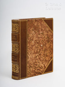 [1738-1879]. Un fort volume in-4°, demi-maroquin fauve à longs grains, grands coins ornés de guirlandes dorées, dos à larges nerfs richement orné de fleurs de lys et d'entrelacs dorés (Reliure anglaise du XIXème siècle de qualité quoique non signée). Très bel exemplaire. Ce recueil se compose de huit suites différentes : 1) - Portrait, titre et 12 planches (20 x 26 cm) rempliées tirées sur chine gravées par John Zeiter, d'après Henry Alken et H. Thomas. Londres chez S. H. Hawkins 183. Quelques rousseurs. Suite inconnue de Rius et Henrich. Seul Palau signale à la même date une autre édition chez Jones & Co. Rarissime. 2) - Portrait, 68 planches (25 x 18 cm) in-4°, gravées par Van der Gucht d'après J. Vanderbank. Suite complète parue à Londres, chez Tomson en 1738. Palau, 52010 ; Rius, 37. 3) - 31 planches in-4° (15 x 19 cm) la plupart gravées par Picard d'après Coypel. La Haye, P. de Hondt, 1746. Palau, 52734 ; Rius, 491. 4) - 16 planches in-8° (11 x 17 cm) gravées en taille douce d'après Stothard. Londres, Strahan, 1782. Palau, 52498 ne donne pas le nombre de planches et Rius (647) n'en signale aucune ! 5) - 31 (sur 32) (6, 5 x 12 cm) eaux-fortes in-12 semblant provenir de la première édition du Gil Blas de Le Sage. Paris, Ribou, 1715-1735. Palau, 136139. 6) - 21 (sur 24) (9 x 11, 5 cm) lithographies coloriées de T. Clark. Londres in-8°, Mc Lean, 1819. Palau, 52521 ; Rius, 669. Suite d'une grande rareté. 7) - 37 eaux-fortes (10 x 14 cm) (in-8° sur japon nacré, signées Lalauze. Edimburg, Paterson, 1879. ) Palau, 52588 ; Rius, 717. 8) - 15 eaux-fortes (9 x 16 cm) in-8° de G. Cruikshank parue à Londres, Wilson, 1833. Il manquerait (d'après Henrich p. 450), un portrait et trois frontispices. Traces de colle sur le pourtour des gravures. Palau , 52532 ; Rius, 680. Très bel ensemble de 233 planches, constitué à la fin du XIXème siècle par un amateur britannique. Deux suites semblent rarissimes : la première (Alken) est peut-être unique, et, la sixième de toute rareté.