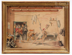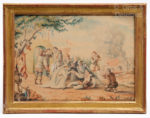 cm x 23 cm. Ces œuvres originales dans l'esprit de Natoire mais plus naïves, pourraient être des essais pour des cartons de tapisseries qui apparemment n'ont jamais été réalisées. Le Dr Leanagan, conservateur de l'Hispanic Society of America, grand spécialiste de l'iconographie Quichottesque n'avait pas connaissance de cette suite originale qui n'est mentionnée nulle part. Nous lui en avons communiqué les photos pour une éventuelle publication. Comme chez Coypel, les principales et les plus connues des aventures de Don Quichotte sont évoquées ici.