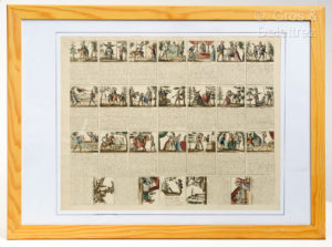 PLANCHE DE CARTES A JOUER. Les Aventures de Don Quichotte. [Paris], [Les marchands de nouveautés], [1810]. Grande planche (109 cm x 71 cm) dont les cartes en couleurs, représentant les plus notables aventures de Don Quichotte, n'ont pas été...