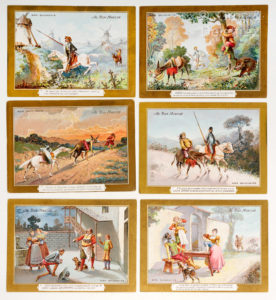 sert de support publicitaire pour une marque connue de chocolat au début du XXème siècle. Ce roman qui n'est pas à proprement parler un livre d'enfants sert souvent de cadre à l'univers enfantin ! Ici, ce sont les chocolats qui sont utilisés pour les attirer. (On joint) Série de six chromolithographies (12 x 16 cm) des aventures de Don Quichotte. Très bel état. Elles servent de «publicité» pour les Magasins du Bon Marché vers 1900.