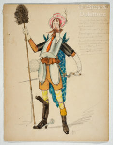 VALLEE (André). Caricature de DON QUICHOTTE traitée à la manière d'Archimboldo. Sans lieu, sans éditeur, [1930 ?]. Ce dessin original, aquarellé et gouaché mesure 23, 5 cm x 30 cm. Don Quichotte est affublé d'accessoires divers : compotier,...