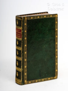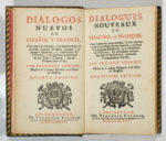 Lengua Española ; la construcion del Universo, y los terminos principales de las Artes y Ciéncias, con un Nomenclator al fin. Bruselas, François Foppens, 1724. Un volume in-12 (6 ff, 350 pp, 1 f), plein maroquin vert bouteille, dos lisse finement orné de dentelles et d'urnes dorées, roulettes dorées sur les plats, dentelles intérieures, tranches dorées (Très fine reliure de l'époque attribuable à Bradel). Très bel exemplaire. Quatrième édition de ces dialogues dont le onzième se déroule entre Hernan Cortès et Moctezuma, et le douzième entre Christophe Colon et Francisco Drack... le tout émaillé de proverbes traduits en français repris de son ouvrage de 1605. Palau, 315619.