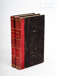 2 ff, 422 pp), demi-veau cerise, dos lisses ornés (Reliure de l'époque), mors et coiffes frottés, rousseurs. Edition originale rare, la seule où figure la philosophie de Sancho Pança. Cité par Sainte Beuve, ce grand classique du XIXème siècle réorganise en quinze grandes séries thématiques le contenu des principaux recueils de proverbes du XIIème au XVIIème siècle. Rappelons que Sancho, incarnant la sagesse populaire, ne s'exprime qu'à l'aide de proverbes. Palau, 136101. Brunet III, 999 : en ce genre, le recueil le plus complet. Ex-libris gravé représentant un ours avec la devise "Vis et Pax" comportant les initiales MGM. Tampon ex-libris d'Antonin 7ES7MES (?).