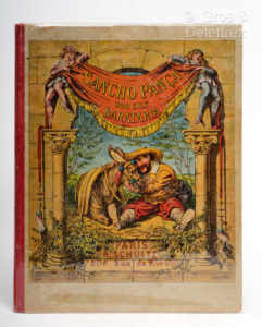 d'éditeur dont les deux plats sont illustrés de chromolithographies, dos de toile rouge. Pages de gardes brunies, coins et bords un peu frottés, premier plat un peu sali. Intérieur très frais. Publication enfantine extrêmement rare dont le texte et les illustrations sont restées anonymes. Elle est illustrée de dix planches hors-texte à pleine page tirées en chromolithographie. Il s'agit du gouvernement de Sancho Pança sur l'île de Barataria, île de fiction que des nobles farceurs lui avaient offerte. Imprimé à Strasbourg par la veuve Berger-Levrault. Edition non mentionnée par Palau. (cf. la réédition de 1995, N°267 de ce catalogue)