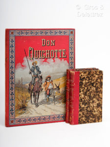 exemplaire. Traduction de Filleau de Saint-Martin revue et arrangée pour les enfants par A. Des Tilleuls. Elle est ornée de 10 gravures. Il s'agit d'une édition parue après 1905 reprenant l'édition in-8 signalée par Henrich (n° 376) parue sans date en 1875. [On joint] : CERVANTES SAAVEDRA (Miguel de). Histoire de Don Quichotte. Paris, Garnier Frères, [1915]. Un volume in-4°, pleine percaline polychrome décorée d'une plaque représentant le tandem Don Quichotte et Sancho sur les chemins de la Manche. Tranches dorées (Reliure de l'époque). Traduction de Florian ; édition illustrée de huit gravures en couleurs hors-texte d'après les dessins de Jules David ; vignettes sur bois d'après les dessins de G. Staal. Edition parue au début du vingtième siècle qui s'apparente encore aux publications du dix-neuvième siècle. Palau, 52971 ne signale qu'une planche.