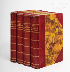 ILLUSTRATIONS DE BERTHOLD MAHN CERVANTES SAAVEDRA (Miguel de). DON QUICHOTTE DE LA MANCHE. Paris, Union Latine d’Editions, 1935. Quatre tomes en quatre volumes in-4° (XVIII-307 pp // 327 pp // 3 ff, 366 pp // 2 ff, 374 pp, 1 f), demi-chagrin rouge...
