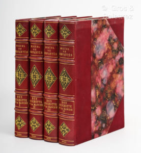 DON QUICHOTTE PAR DUBOUT CERVANTES (Miguel de). L'INGENIEUX HIDALGO DON QUICHOTTE DE LA MANCHE. Paris, Sous l'Emblème du Secrétaire, 1938. Quatre tomes en quatre volumes in-4°, demi-chagrin à coins lie-de-vin, dos à nerfs mosaiqués et richement...