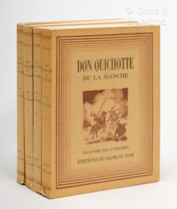 CERVANTES SAAVEDRA (Miguel de). DON QUICHOTTE DE LA MANCHE. Paris, Editions du Rameau d'Or, [1945]. Quatre tomes en quatre volumes in-4° (2 ff, 228 pp // 2 ff, 218 pp // 2 ff, 249 pp // 2 ff, 253 pp, 1 f), brochés. Premier tirage des 180 aquarelles...