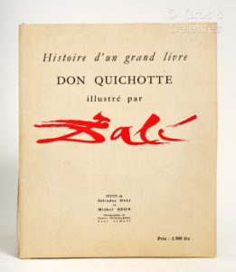 plaquette enrichie d'une lithographie en couleurs à pleine page refusée pour l'édition finale. "Don Quichotte aperçoit le premier moulin, de la violence de la lutte qu'il va engager, sa tête éclate... La "tête" est née d'une ampoule électrique remplie d'encre lithographique que Dali a laissé tomber... Elle clôt la rencontre de Dali avec l'art lithographique. " Envoi signé de Salvador Dali sur la première page, daté de 1957. [On joint] : un carton d'invitation pour le vernissage de l'exposition du Livre le plus cher du Monde le jeudi 12 décembre 1957 au Musée Jacquemart-André.