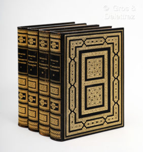 caissons et entrelacs dorés, dos richement ornés de caissons et motifs dorés (Copie de la célèbre reliure Mudejar de la collection privée de S. E. M. le duc d'Albe à Séville. Elle est reproduite par Henri Randeynes, Maître-Relieur). Bel exemplaire conservé sous étui. Excellente traduction de Louis Viardot. L'édition est composée en Plantin corps 12, elle sort des presses de Georges Lang et Les Petits-Fils de Léonard Danel. 1 des 4000 exemplaires tirés sur vélin des papeteries de Navarre. Elle est illustrée de très nombreuses gouaches en couleurs, hors-texte et de vignettes par José-Luis Rey Villa. Très intéressante notice biographique de Luis Astrana Maria, président de la Societa Cervantine. On y apprend qu'au milieu du vingtième siècle il y avait 850 éditions en langue espagnole, 400 en français et 314 en anglais ! [On joint] : Trois estampes en couleurs (19 x 24 cm) de Jose-Luis Rey-Vila publiées à l'occasion de l'année Cervantes par le Comité Français des Amis de Miguel de Cervantes ; sous chemise.