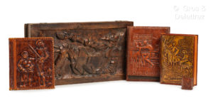 éditeur, [c. 1940]. Mesures: 26 x 49 cm et 7 cm d'épaisseur. [On joint] : un étui de boîte d'allumettes en cuir repoussé représentant nos deux héros sur le recto et Cervantes sur le verso. Elle mesure 5 x 4, 5 cm. [On joint] : un étui de correspondance en cuir repoussé (19 x 25 cm) qui nous montre sur le premier plat Don Quichotte dans sa bibliothèque en compagnie de son lévrier (Espagne, XXème siècle). (On joint) Un couvre-livre en cuir repoussé représentant sur un plat Don Quichotte et Sancho et sur l’autre le portrait de Cervantes. (milieu XXème siècle) Ensemble peu commun.