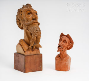 (15 , 5 cm). Sculpture très réaliste qui nous montre un Don Quichotte fatigué et très marqué par la vie ! (on joint) une tête en bois de Don Quichotte, très expressive (21 cm) sur socle.
