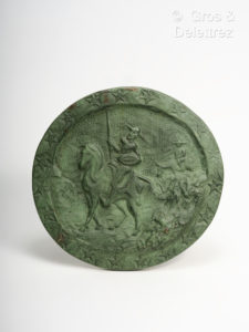D'APRES CERVANTES. DON QUICHOTTE A CHEVAL ACCOMPAGNE DE SON ECUYER SANCHO PANCA. Espagne ? Sans éditeur, [début XX ème]. Grand plat (36 cm) de céramique verdâtre. La scène centrale est entourée d'un pourtour d'étoiles. Cachet de provenance...