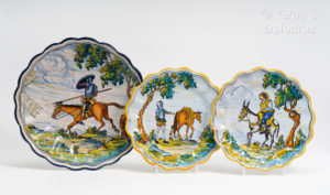 FAIENCE DE TALAVERA DEUX ASSIETTES EN COULEURS DU XIXème. DON QUICHOTTE EN ARMURE. Talavera, Sans éditeur, [début XXème siècle]. Elles sont en couleurs ; les bords sont festonnés. Elles mesurent 26 cm de diamètre. Ce sont des faïences de...